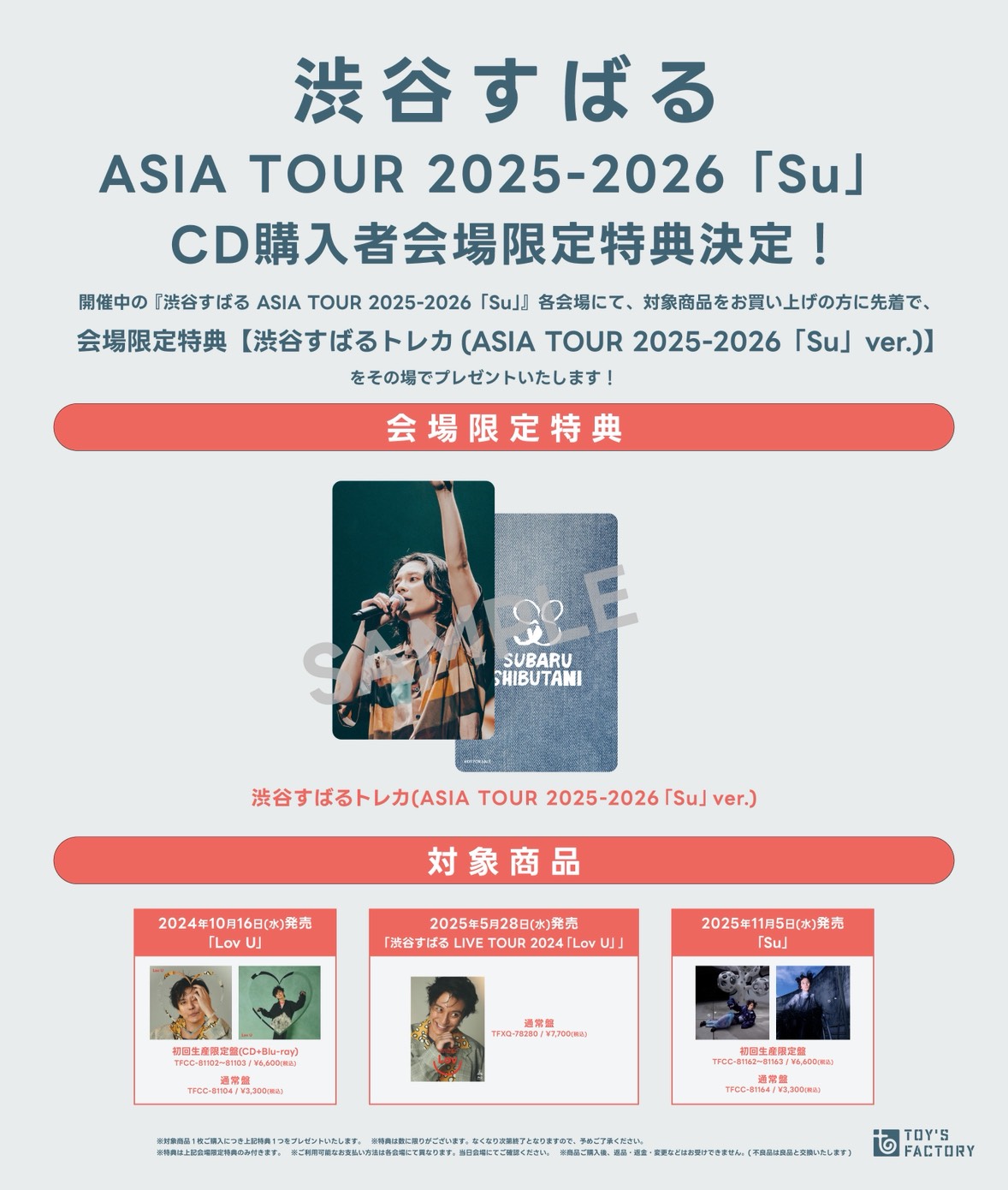 現在開催中の 『渋谷すばる ASIA TOUR 2025-2026「Su」』各会場にて、対象商品をお買い上げの方に先着で、会場限定特典【渋谷すばるトレカ(ASIA TOUR 2025-2026「Su」ver.)】をその場でプレゼントいたします!